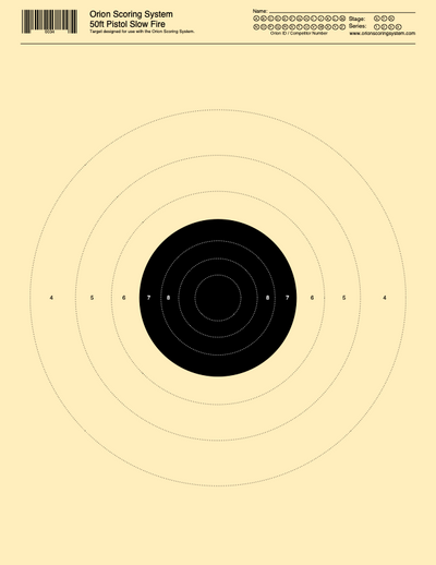 The 50ft Conventional Pistol Slow Fire Target is commonly used for training or competitions with the Civilian Marksmanship Program or National Rifle Association rulebooks. It is sometimes refered to as the Gallery League pistol target. It may be used in conjunction with the Timed and Rapid Fire target for both gallery league course of fire or the CMP's Presidents 100 course of fire.