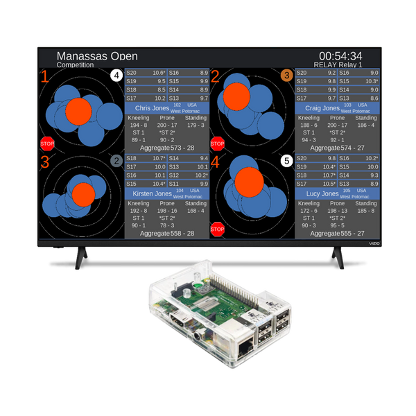 The MM100 Spectator Display brings lives scores to an audience via any HDMI-compatible display. It comes with a suite of pre-programmed screens that change throughout a Course of Fire, and is highly customizable to showcase a live view of athlete target, ranked and squadding lists, and more, enhancing the spectator experience and enabling coaches to have a better view of the firing line. View up to 8 targets at a time on one screen, or 16 total as it rotates through.