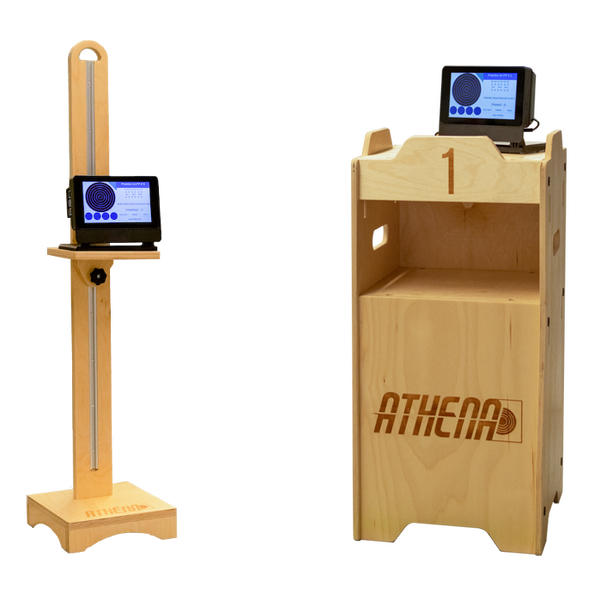 Athlete tables and monitor stands assist the athlete to hold their athlete monitor and other equipment at their position on the firing line. Scopos offers 3 different sizes to suit any need. The monitor stand holds only a monitor. The three-position athlete table is sized smaller to fit junior shooters. The international rules athlete table is sized in accordance with ISSF rules, and is required when shooting under international rulebooks. All stands and tables are available to custom laser engrave your name or logo.